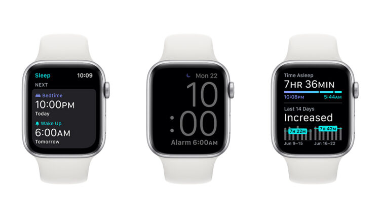 مع watchOS 7، تقدم Apple Watch إمكانية تتبع النوم، مستندة إلى نظرة شمولية حول النوم من خلال توفير أدوات قيّمة لمساعدة المستخدمين على الحصول على كمية النوم التي يريدونها، والخلود إلى النوم في الموعد المناسب، واتباع روتين قبل النوم لتحقيق أهدافهم في النوم، ومن خلال استشعار حركات دقيقة عبر مقياس التسارع في الساعة تشير إلى التنفس أثناء النوم، تستطيع Apple Watch أن تكتشف بذكاء إذا كان مرتديها نائماً وكمية النوم التي يحصل عليها خلال كل ليلة، وفي الصباح، يرى المستخدم عرضاً لحالة نومه في الليلة السابقة، بما في ذلك فترات الاستيقاظ والنوم، ويطلع أيضاً على مخطط يعرض مستويات النوم خلال الأسبوع.