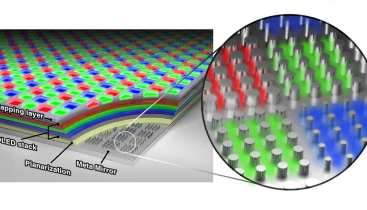 يغير هذا “السطح الخفي البصري” الخصائص الانعكاسية ويسمح لألوان معينة بالصدى من خلال البكسل، ويسمح التصميم بكثافة بكسل أعلى بكثير مما تراه في RGB OLEDs على الهواتف، لكنه لا يضر السطوع بالدرجة التي تراها مع OLEDs البيضاء في بعض أجهزة التلفزيون.
