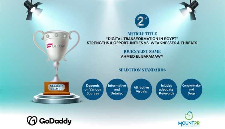 حصد موقع FollowICT جائزة “غودادي” المنصة الأكبر لخدمة الشركات وتمكين وتحفيز رواد الأعمال حول العالم، لأفضل تحقيق صحفي عن التحول الرقمي في مصر، مدعوما بأدوات ومحتوى رقمي، ضمن سلسلة جوائز أعلنتها الشركة لعدد من المقالات المتميزة التي اتسمت وفقا لبيان الشركة بالجودة والإبداع، مع اختيار زوايا متنوعة وجذابة، واستخدام مصادر معلومات وإحصائيات حديثة وذات صلة مباشرة، بالإضافة إلى توظيف جيد للوسائط المتعددة.