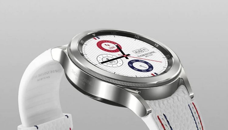 تم كشف النقاب عن هذا الإصدار من Watch4 Classic رسميًا بواسطة Samsung وسيبلغ سعره 800 دولار. يشتمل الصندوق على ما مجموعه ثلاثة أحزمة معصم من Thom Browne وشاحن يحمل علامة Thom Browne ثلاثية الألوان، وساعة Watch4 Classic مطلية بالروديوم لإضفاء لمسة نهائية لامعة، وتأتي أيضًا مع خمسة وجوه لساعة Thom Browne محملة مسبقًا. يأتي هذا الإصدار بحجم 42 مم من طراز Bluetooth للساعة الذكية.